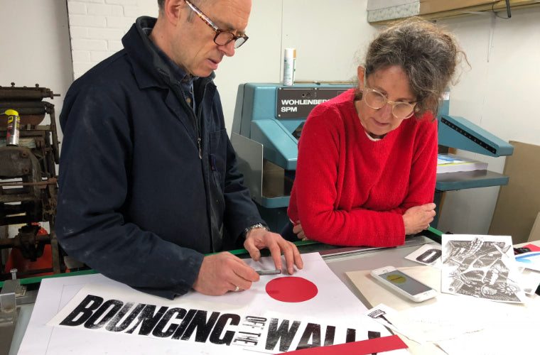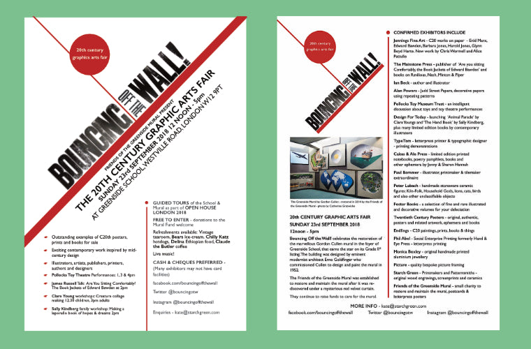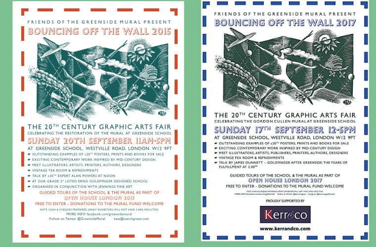 Firstly a series of posters for the Greenside Lectures, talks on Hammersmith artists to kick off the fundraising campaign. Secondly, communications for the first Bouncing Off the Wall! C20th Graphic Arts Fair in 2014 - to launch the restored mural with a ribbon cutting by Cullen’s widow, Jacqueline and a fabulous array of artists, illustrators, publishers and art dealers. We designed all the publicity and created a letterpress poster with Helen Ingham at CSM using a specially made wood engraving and borders by Jonathan and hand set type. We continued with the design though fairs in 2015 - 2017.