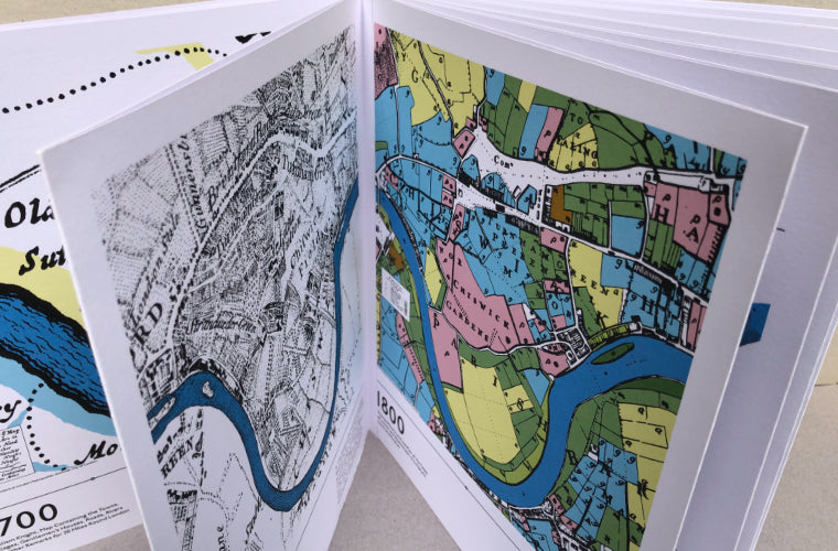 We were briefed to create a memento for the launch of the completed mural (I won’t go into the trials and tribulations, nay pain, that was involved for Karen and Sarah to get there). We looked at various interesting formats and sizes and decided on a concertina book that showed every panel of the mural with history and details on the back of each page. The cover design reflects the riverside location and uses a tiny tree symbol from one of the maps. Transport for London part-funded and allowed the siting of the mural, so it seemed appropriate (and lovely) to use their typeface, Johnston - designed by local resident Edward Johnston in 1913. A copy of the book was given to every school in Chiswick and the limited edition was sold to raise funds for the mural.