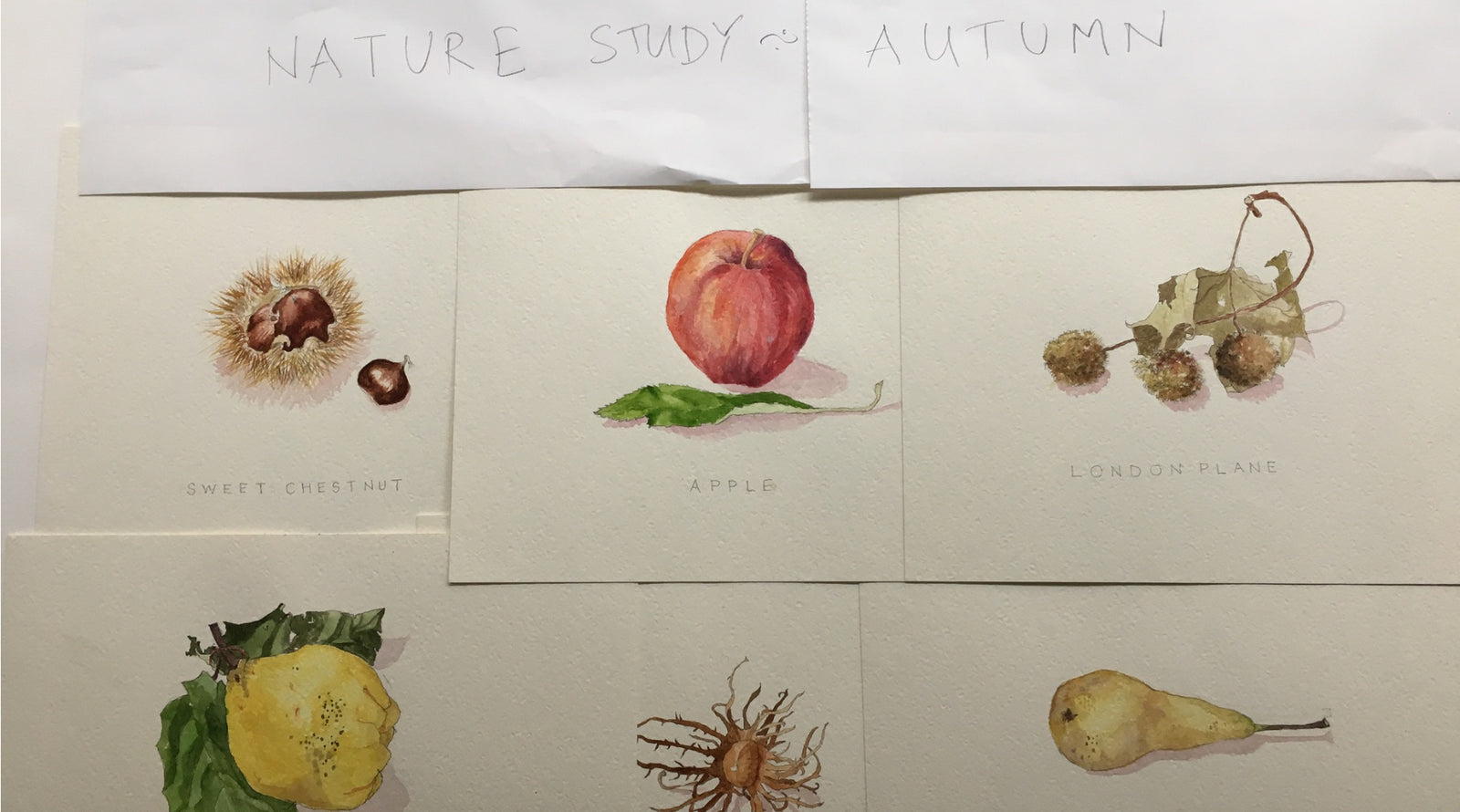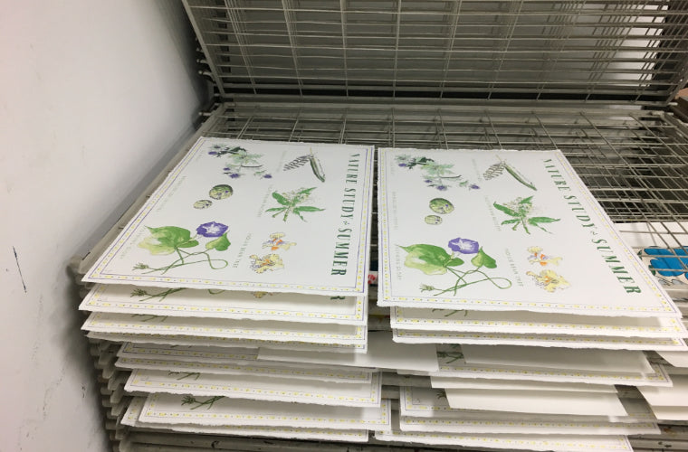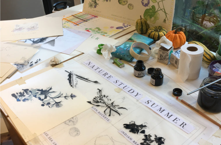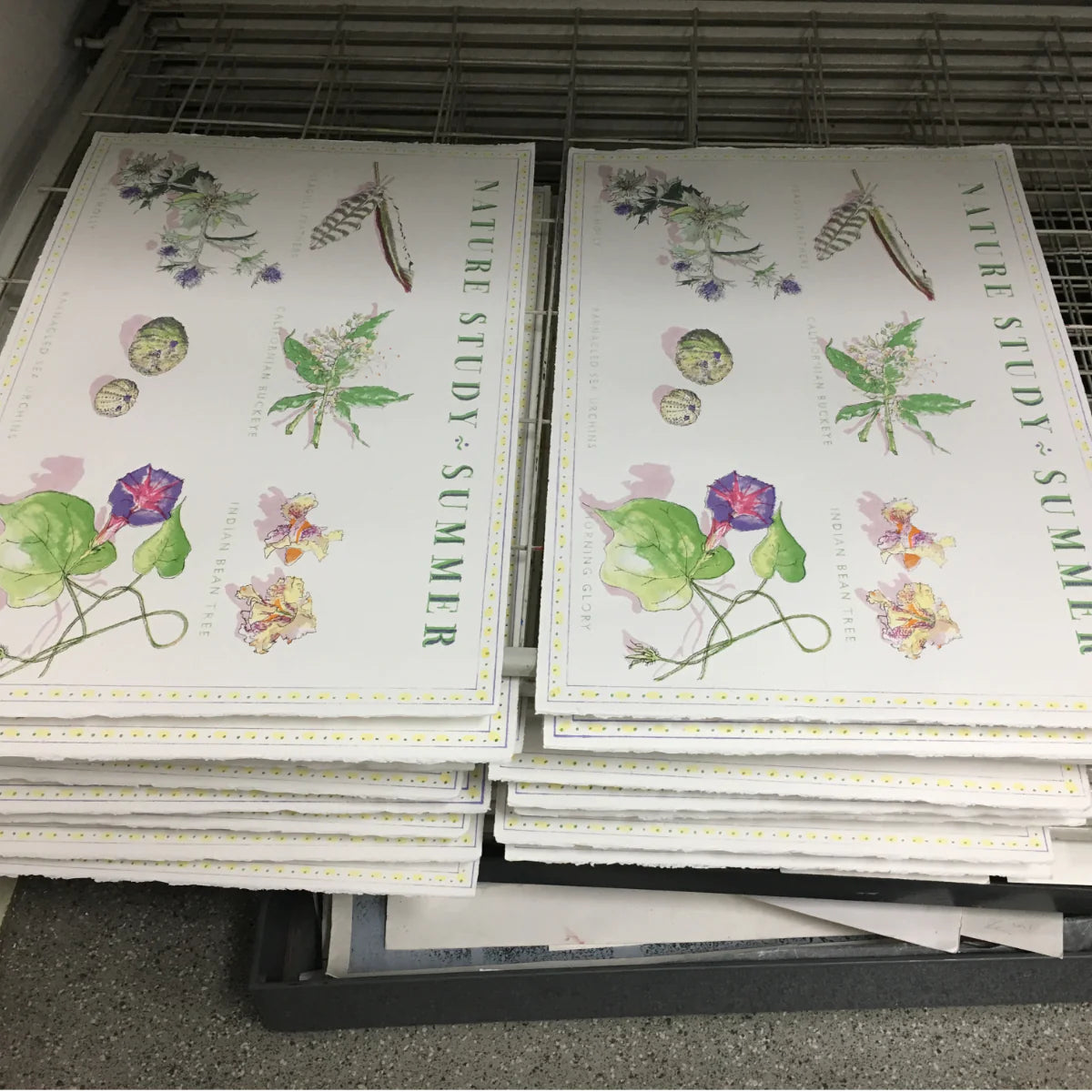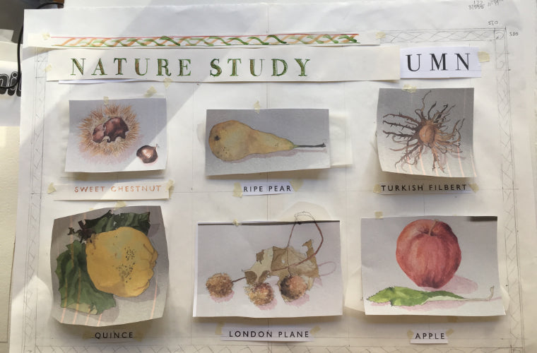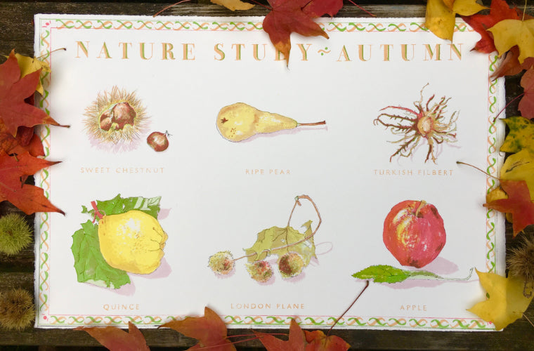 Nature Study - Seasons is a quartet of screenprints, inspired by mid-century School Prints and vintage educational posters. Using watercolour studies of individual natural treasures, Kate develops a poster design with hand-drawn type. Colour separations are painted by hand on overlays to make a separate screen for each colour - usually 9 or 10 colours.